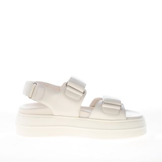 H680 sandal made in yogurt tone leather with two hook and loop bands at toe. Slingback closure with hook and loop strap. Rubber platform sole with height 4,5 cm