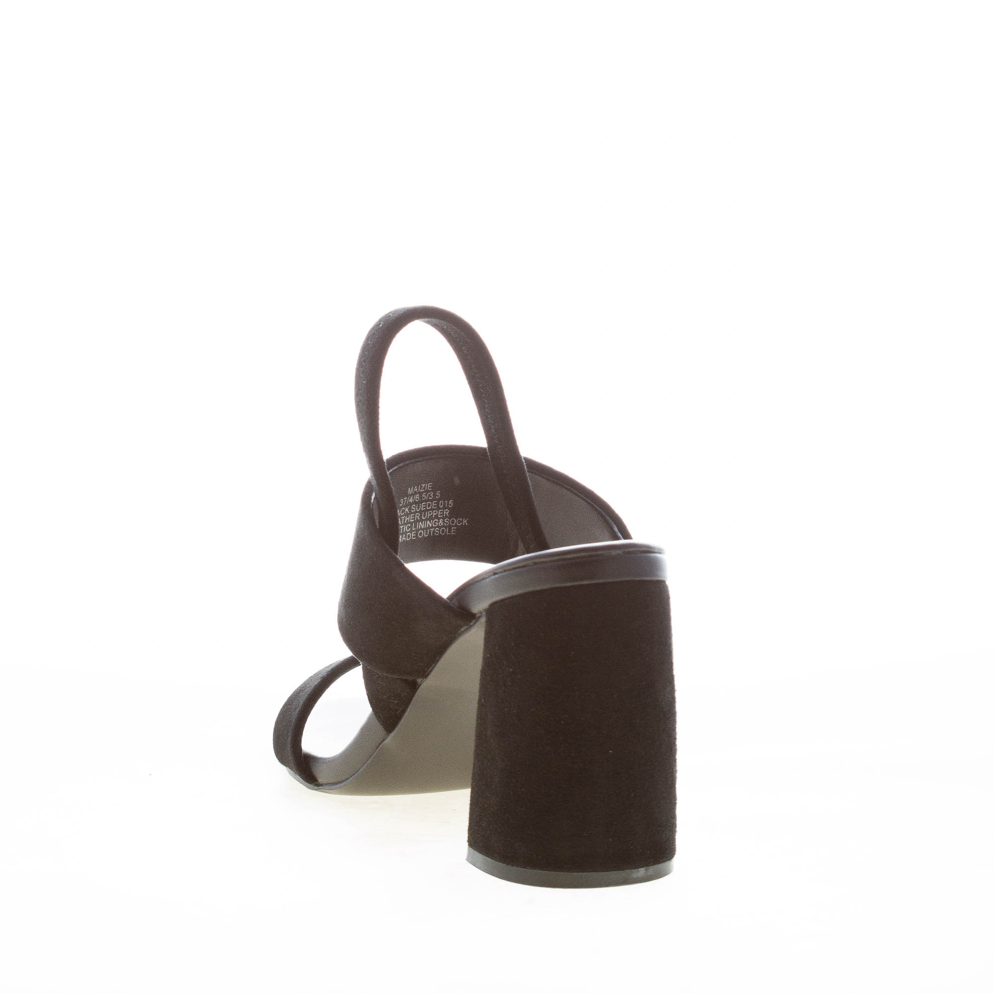 Black suede Maizie heel sandal with two open-toe bands and a stretched slingback strap. Block heel 8,5 cm. Man-made outsole