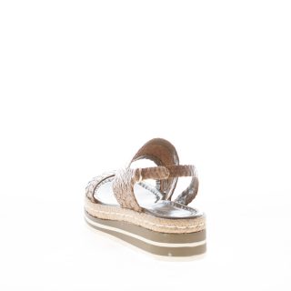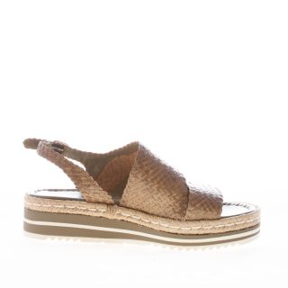 Sandalo platform Milan realizzato in pelle intrecciata a mano marrone chiaro con fascia ondulata sul piede. Chiusura con cinturino al tallone e fibbia argento regolabile. Dettaglio in rafia naturale lungo tutto il bordo del platform. Platform di 3 cm. Suola in gomma. Zeppa multicolore di 4 cm