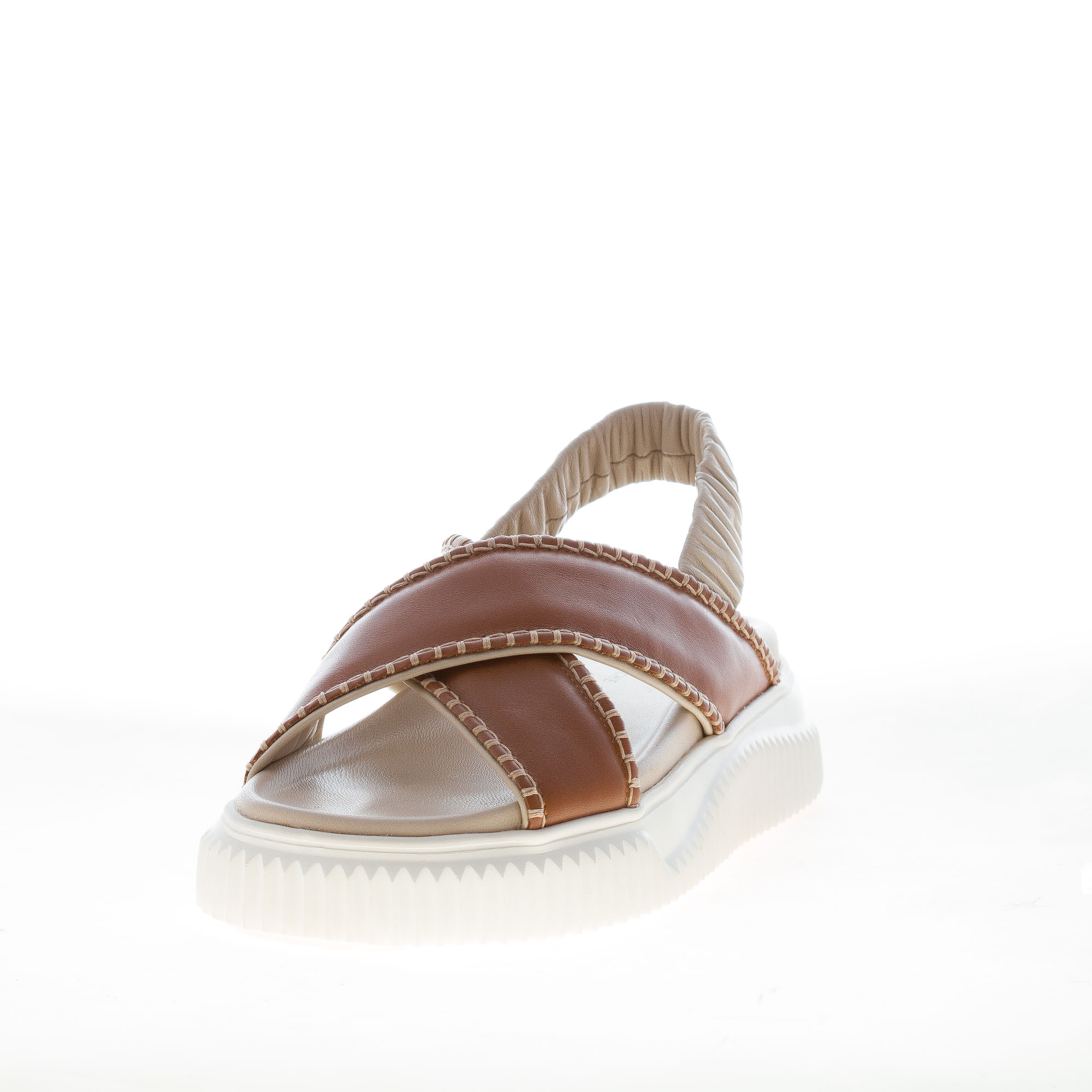 Brown leather sporty sandal Swami with two front crossed maxy bands and a slingback elastic beige strap fastening. White rubber wedge sole of 4,5 cm with knurled profile