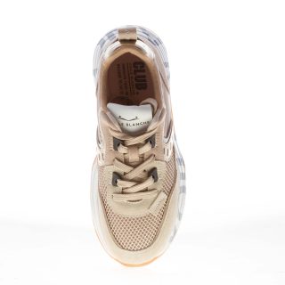 Sneaker Club105 realizzata in camoscio e tessuto tecnico a rete beige con inserti in tessuto e pelle laminata platino. Talloncino logato platino. Allacciatura con occhielli hiking. Suola effetto plateau ultraleggera con serigrafia brand