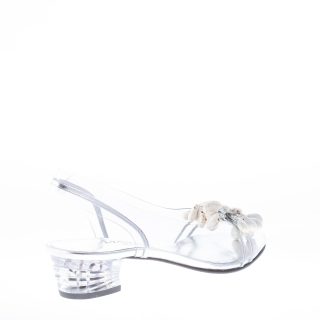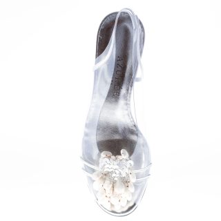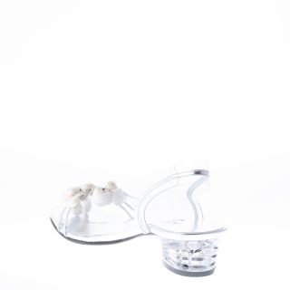 Transparent “crystal” NUAGO sandal with silver leather trim. Ivory marble effect stones detail at open toe. Leather sole. Tansparent heel 3 cm