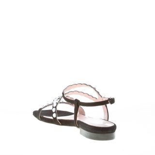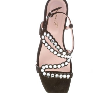 Sandalo basso realizzato in camoscio nero con listini incrociati sul piede decorati da strass. Chiusura posteriore con cinturino e fibbia regolabile. Tacco di 2,5 cm. Suola in cuoio