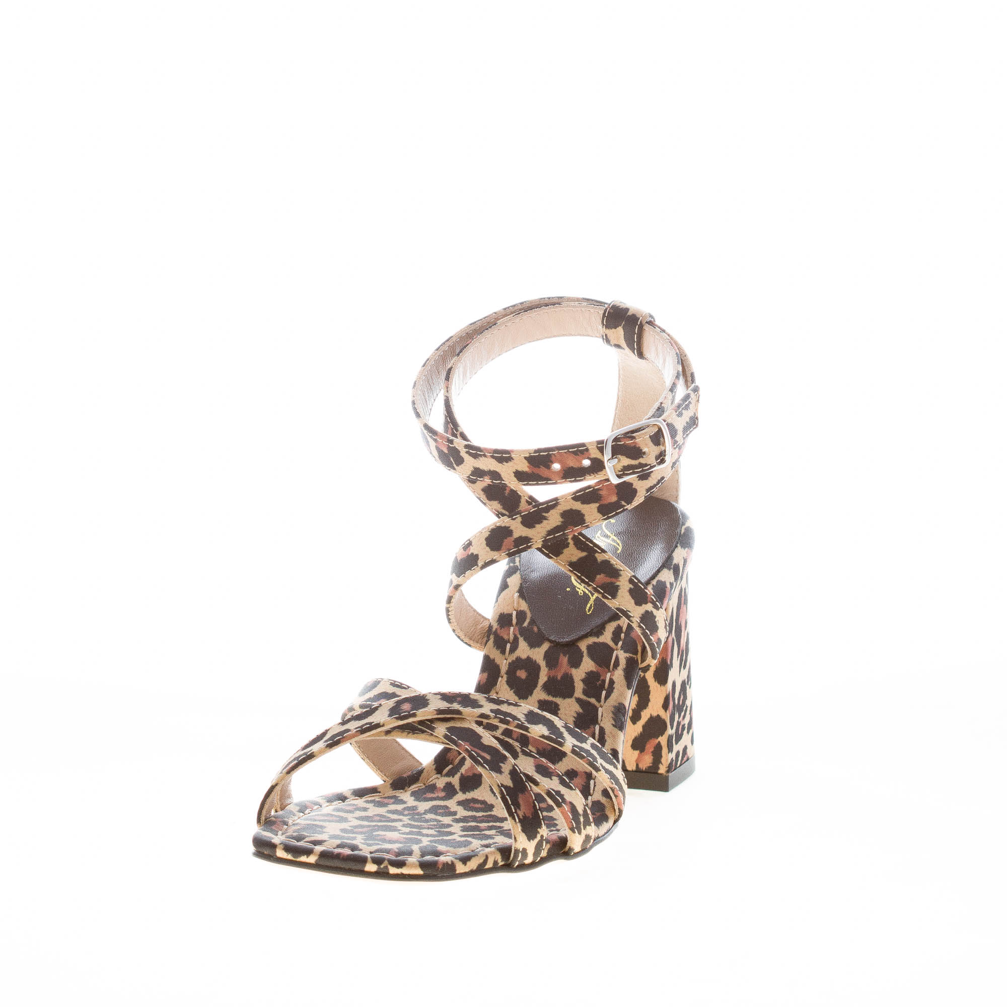 Animalier fabric made in Italy sandal with crossed thin open toe straps. Ankle strap closure with crossed buckled strap. Large heel 7,5 cm. Leather sole