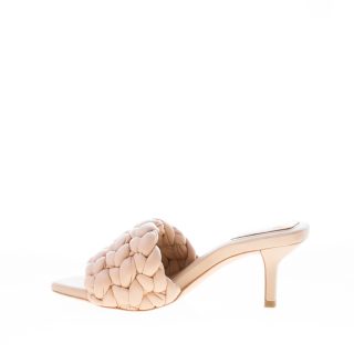 Tan nude faux leather Roses mule with a large open toe braided band. Heel 6 cm. Leather sole