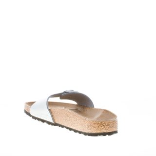 Silver syntetic material Birko-Flor Madrid BS slide sandal with a single strap and an adjustable metal buckle. Anatomically shaped cork-latex footbed. Narrow fit. Eva sole