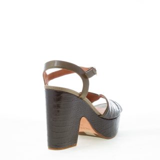 Sandalo Dede realizzato in pelle stampa coccodrillo nero con dettagli in pelle verde. Cinturino alla caviglia in pelle verde con fibbietta regolabile. Platform rivestito a stampa cocco di 3,5 cm. Suola in cuoio con inserto in gomma antiscivolo. Tacco rivestito di 11 cm