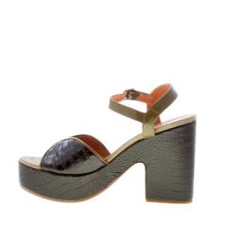 Dede platform sandal made in black croco-embossed leather and green leather. Slingback closure with a green strap and an adjustable metal buckle. Covered platform 3,5 cm. Leather sole with anti-slippering rubber insert. Covered heel 11 cm
