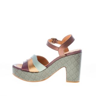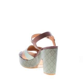 Yeva sandal with multicolor open toe leather waved bands in the tones of grape, bronze and mud. Leather ankle strap with adjustable metal buckle closure. Covered mosaic print platform and heel. Platform 3 cm. Mixed leather and rubber sole. Heel approximately 9 cm
