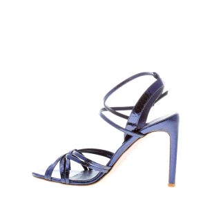 Sandalo Ami realizzato in pelle stampa rettile lucida colore blu oceano con sottili listini incrociati sul piede e chiusura con cinturino alla caviglia e fibbietta regolabile in metallo argento. Tacco stiletto rivestito in pelle di 9,5 cm. Suola in cuoio