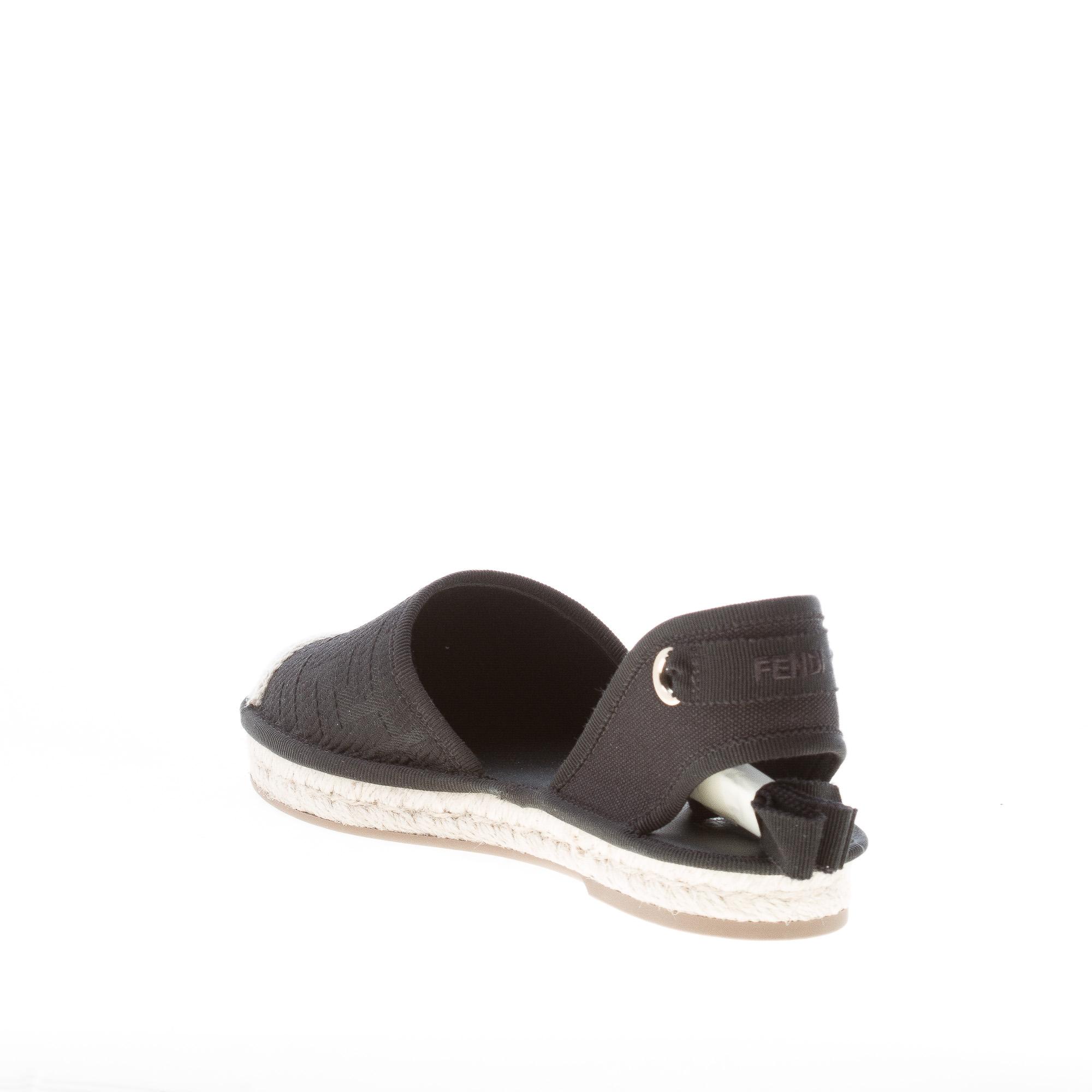 Sandalo espadrillas realizzato in tessuto canvas nero ricamato con l’iconico motivo FF. Allacciatura in grosgrain