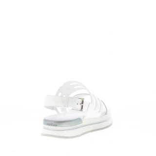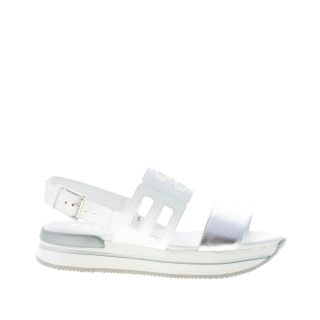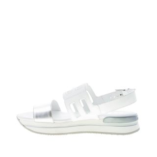 Sandalo H257 realizzato con fascia intagliata in pelle bianca e fascia sul piede in pelle metallizzata argento. Chiusura posteriore con cinturino e fibbia regolabile. Spoiler al tallone in gomma con brand. Suola platform in Eva ultraleggera bianca con dettaglio in gomma. Altezza 3,5 cm