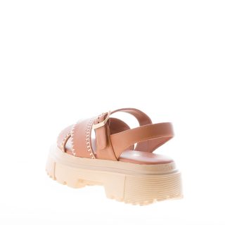 Sandalo H644 realizzato in morbida nappa colore cuoio con doppia fascia incrociata e dettagli con impunture a contrasto. Chiusura alla caviglia con cinturino e fibbia dorata regolabile. Suola con dettaglio carrarmato in gomma ultraleggera. Altezza 4 cm