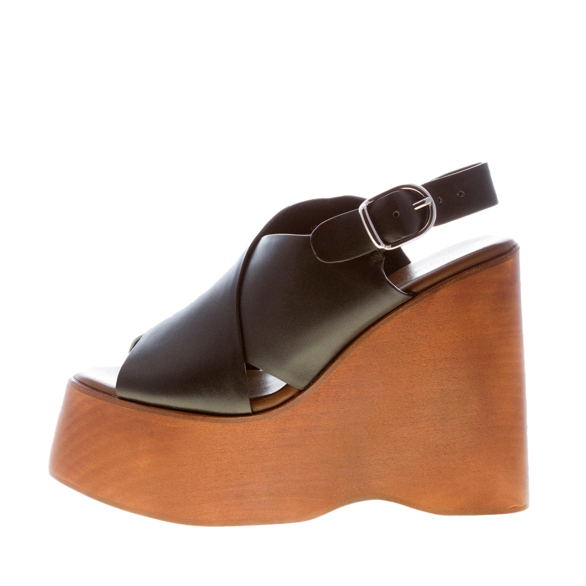 Black leather Fiddle wedge platform sandal with two large crossed bands at the open toe. Slingback closure with adjustable metal buckle. Wooden platform of 5,5 cm and wedge of 13 cm height. Faux rubber sole