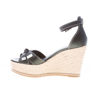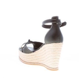 Ripley Wedge black leather sandal with crossed front bands and bow embellishment with branded metal accents. Ankle strap with adjustable buckle closure. Braided raffia wedge 11 cm and platform 4 cm. Rubber sole
