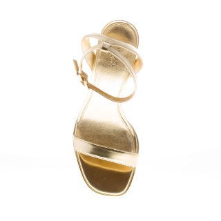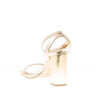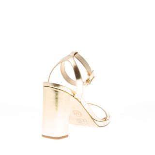 Sandalo Angela Ankle Strap realizzato in pelle metallizzata oro con una singola sottile fascetta sul piede. Chiusura con cinturino alla caviglia e fibbietta in metallo regolabile. Dettaglio brand logo in metallo dorato alla caviglia. Tacco largo di 10,5 cm. Suola in gomma simil-cuoio