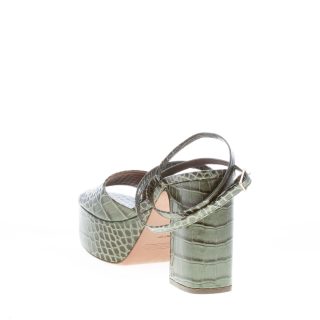Green croco embossed leather sandal with a massive platform and a crossed ankle strap fastening with adjustable buckle. Leather sole. Platform 4 cm. Heel 11 cm