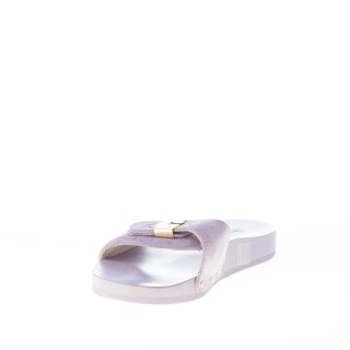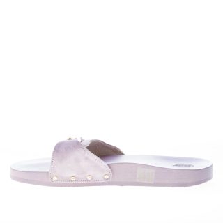 Iconico zoccolo Pescura Natalie realizzato in legno di faggio con fascetta regolabile in camoscio colore lilla. Suola in Eva. Altezza circa 2 cm