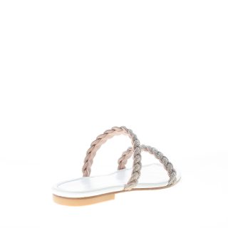 Sandalo slide Addison realizzato in nappa bianca con due cinturini intrecciati sul piede impreziositi da cristalli. Suola in cuoio. Tacco 1 cm