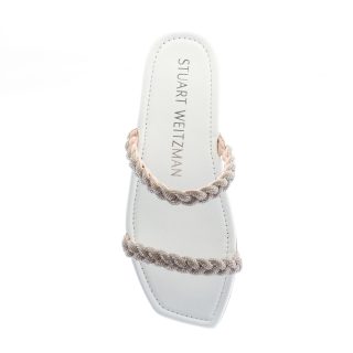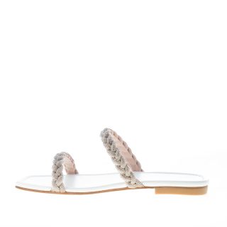 White leather Addison slide sandal with two braided straps and gemstone trimming. Leather sole. Heel 1 cm