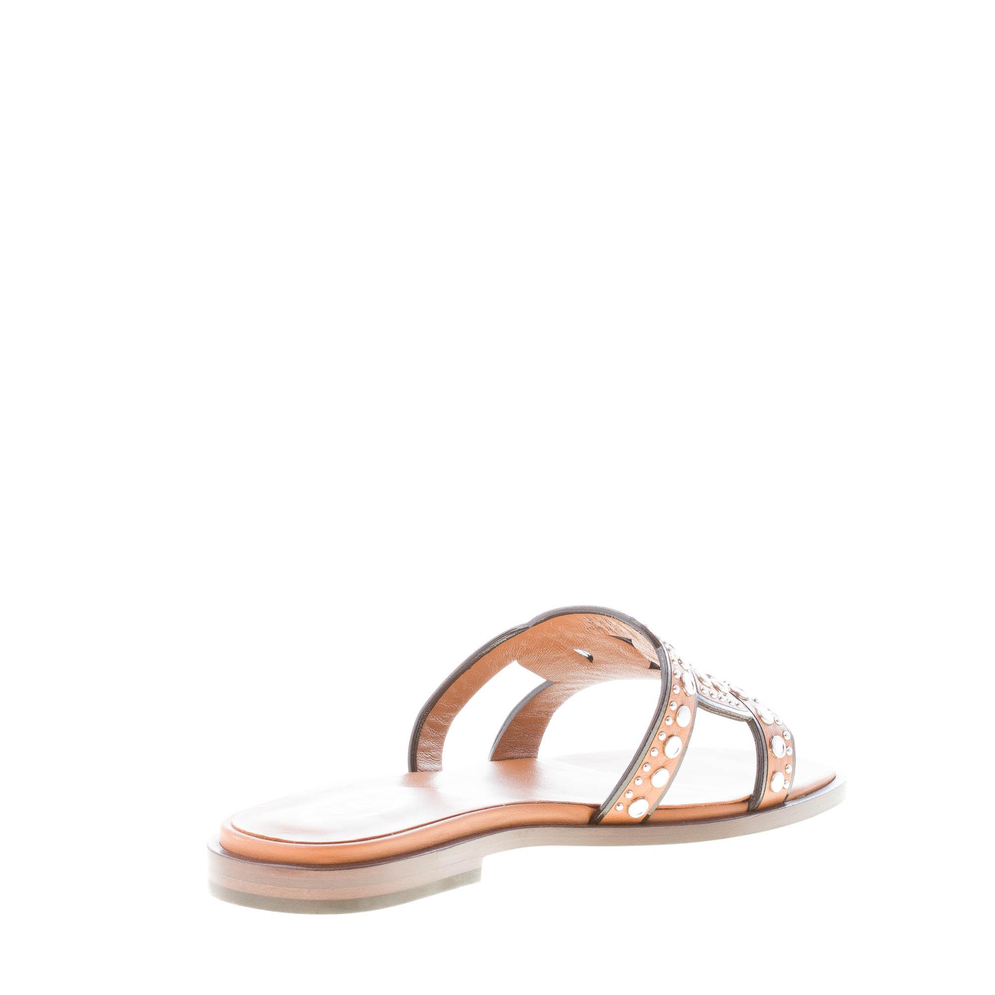 Sandalo ciabatta basso realizzato in raffinata pelle di capra colore cuoio con larga fascia intrecciata sul piede per riprodurre l’iconico accessorio catena. La fascia è decorata con borchiette in metallo. Suola in cuoio. Tacco 1,5 cm