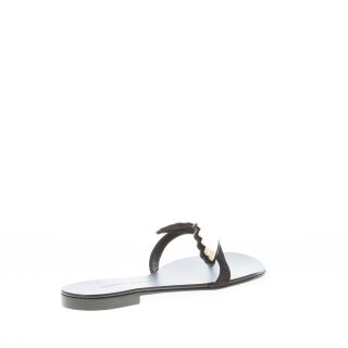 Sandalo infradito 2.0 Cruel realizzato in camoscio nero con l’iconica appliqué Cruel in metallo dorato. Tacco di 1 cm. Suola in cuoio