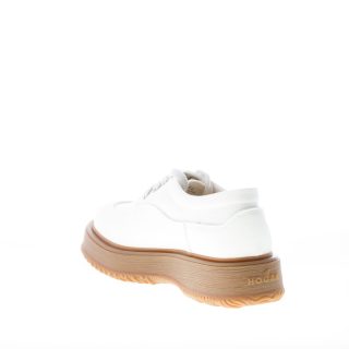 Scarpa stringata derby Untraditional Hogan 3R Recyle, evoluzione eco-sostenibile del modello storico Traditional. Tomaia in canvas e pelle sintetica colore avorio. Fussbet removibile imbottito in Airtex. Suola in gomma a contrasto