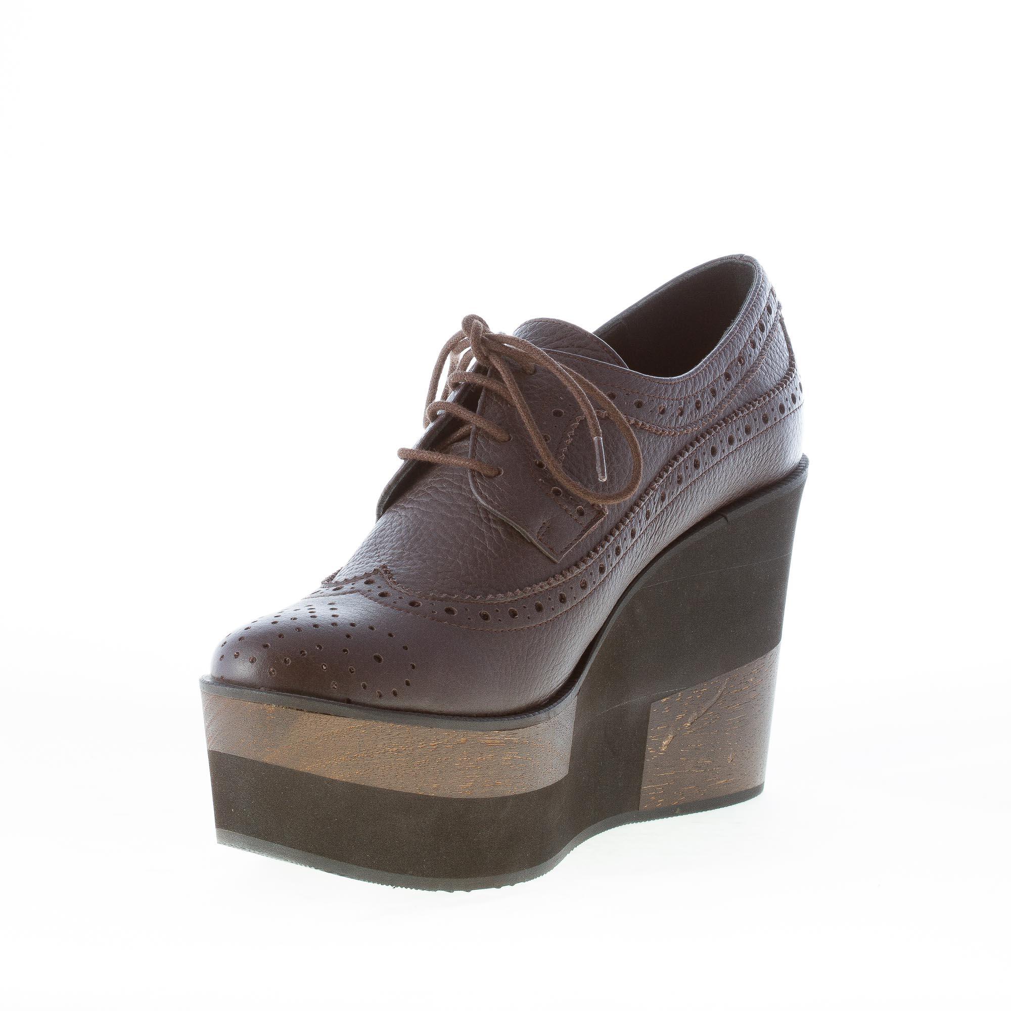 Brown pebbled leather Carolina lace up shoes with the classic wingtip derby detailing. Wood and black rubber maxi-wedge. Rubber sole. Wedge height 10 cm and platform height 5 cm