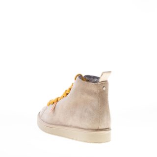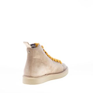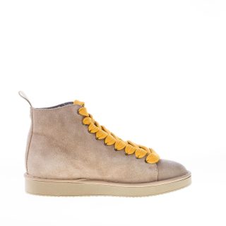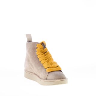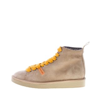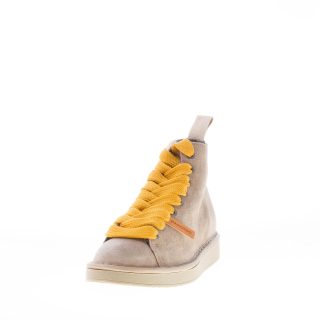 Polacchino della linea P01 realizzato in pelle scamosciata walnut con lacci gialli. Lacci di ricambio beige inclusi. Fodera interna in eco-pelliccia. Plantare removibile. Suola in gomma. Altezza 2,7 cm