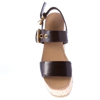 Black leather wedge sandal with two golden buckles. Cork wedge. Rubber sole. Heel 7 cm