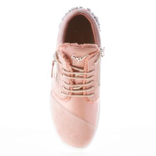 Singleg pink suede and satin runner sneaker with the iconic zip on sides. Crystals enbellishment at back