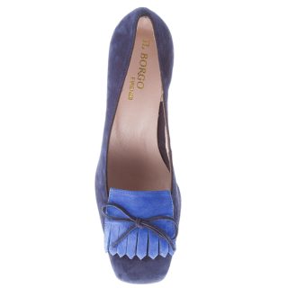 Décolletèéin camoscio blu con maxi frangia a contrasto e laccetto. Suola in cuoio. Tacco 5 cm