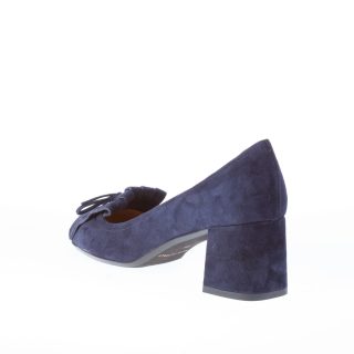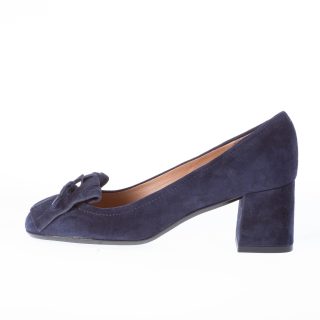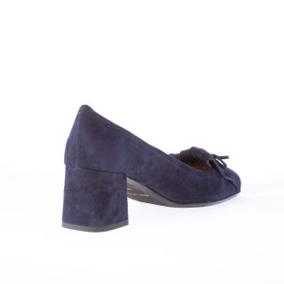Décolleté in camoscio blu con frangia e fiocco. Suola in gomma.Tacco 5,5 cm