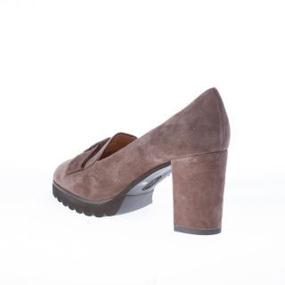 Décolleté accollato in camoscio marrone con fiocco. Suola in gomma con leggero plateau. Tacco 7,5 cm