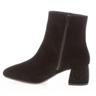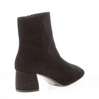 Black suede ankle boot with side zip closure. Rubber sole. Heel 5 cm with strass detail