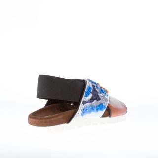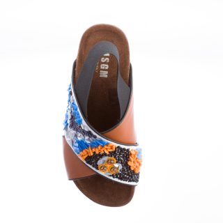 Brown leather with black and white fabric crisscross sandal. Multicolor embellishment on vamp. Black elasticized strap. Rubber sole. Heel 3 cm