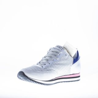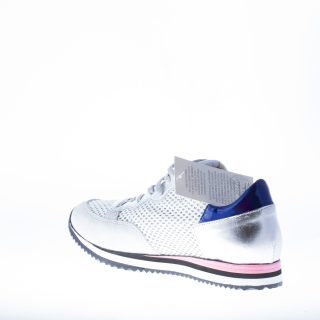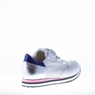 Silver leather with white and silver tech fabric mesh panel sneaker. Light grey suede trim