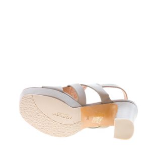 Sandalo in pelle fango con fascia frontale accollata e leggermente elasticizzata. Plateau di 3 cm. Tacco di 10 cm. Suola mista cuoio e gomma