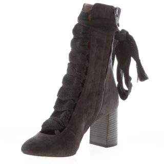“Harper” iconic charcoal black suede round toe ankle boot featured with a lace-up front, oversize laces and a side zip closure. Leather sole. Flared block heel 7 cm