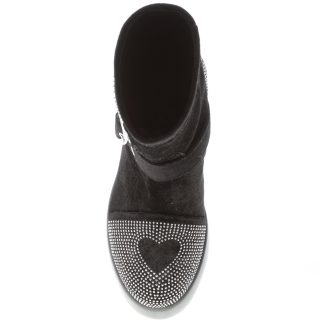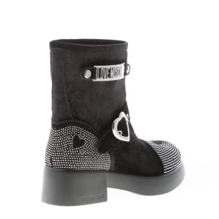 Stivaletto modello Urban in velluto nero con applicazione di microborchie argento sulla punta ed al tallone. Cinturino frontale con fibbia a forma di cuore. Dettaglio laterale in metallo argento con logo. Calzata slip-on. Tacco 5 cm. Suola in gomma