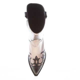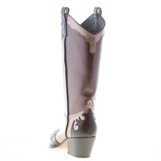 Stivale texano in morbida pelle ad effetto laminato nero e bronzo con ricami sulla punta e sul tallone. Da indossare senza zip. Gambale di circa 30 cm. Suola in cuoio. Tacco 5,5 cm