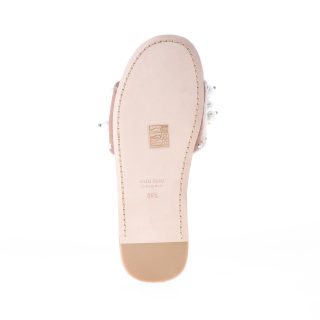 Old rose Cameo velvet slide sandal embellished with a rich faux pearls detailing and silver metal studs on the single strap. Leather sole