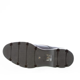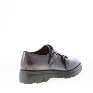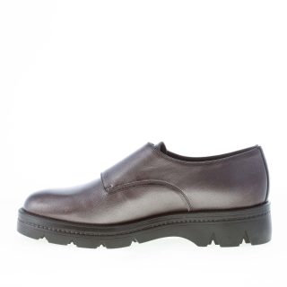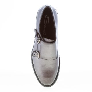 Scarpa con doppia fibbia realizzata in morbida nappa perlata colore grigio piombo. Suola in gomma leggermente rialzata con un’altezza al tacco di circa 4 cm