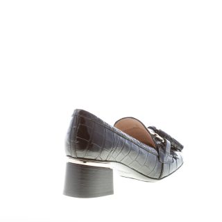 Black crocodile print leather pump with a front maxi fringe decorated with tassels and a branded silver metal chain. Heel 5 cm with a metal detail. Leather sole with an antislippering rubber insert and embossed iconic pebbles