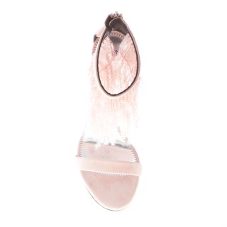 Sandalo in camoscio cipria con calzata slip on e chiusura con zip posteriore. Dettaglio frontale con frangia di piume e