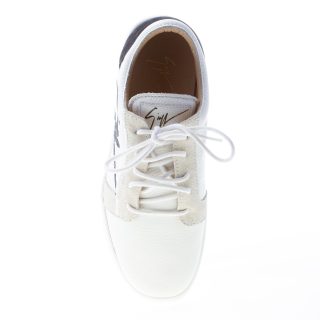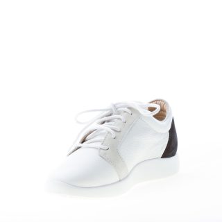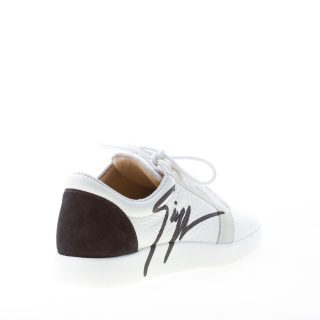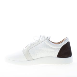 Singleg white leather low sneaker with a black bold logo detail on side. Beige and black suede trims. Leather logo patch at padded tongue. Lightweight rubber sole