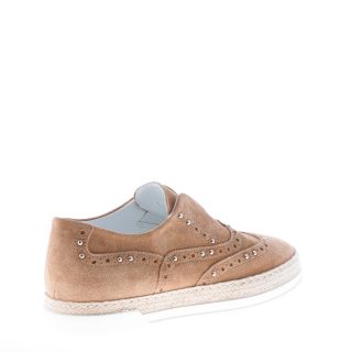 Scarpa slip on in camoscio beige realizzata in stile francesina e rifinita con borchie argento e dettaglio corda intrecciata. Inserto elastico al collo del piede per facilitare la calzata. Suola in gomma