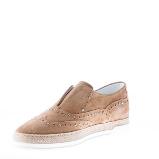 Beige suede slip on shoes featured in oxford wingtip style. Silver metal studs accents and rope detailing. Ease dress elastic insets at tongue. Rubber sole