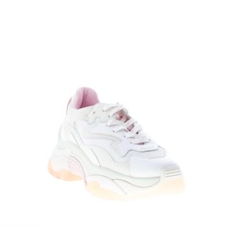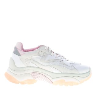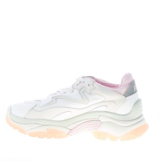 Sneaker Addict realizzata in un mix di nabuk, nappa tessuto a rete bianco con dettagli rosa. Logo brand al tallone. Suola rialzata in gomma