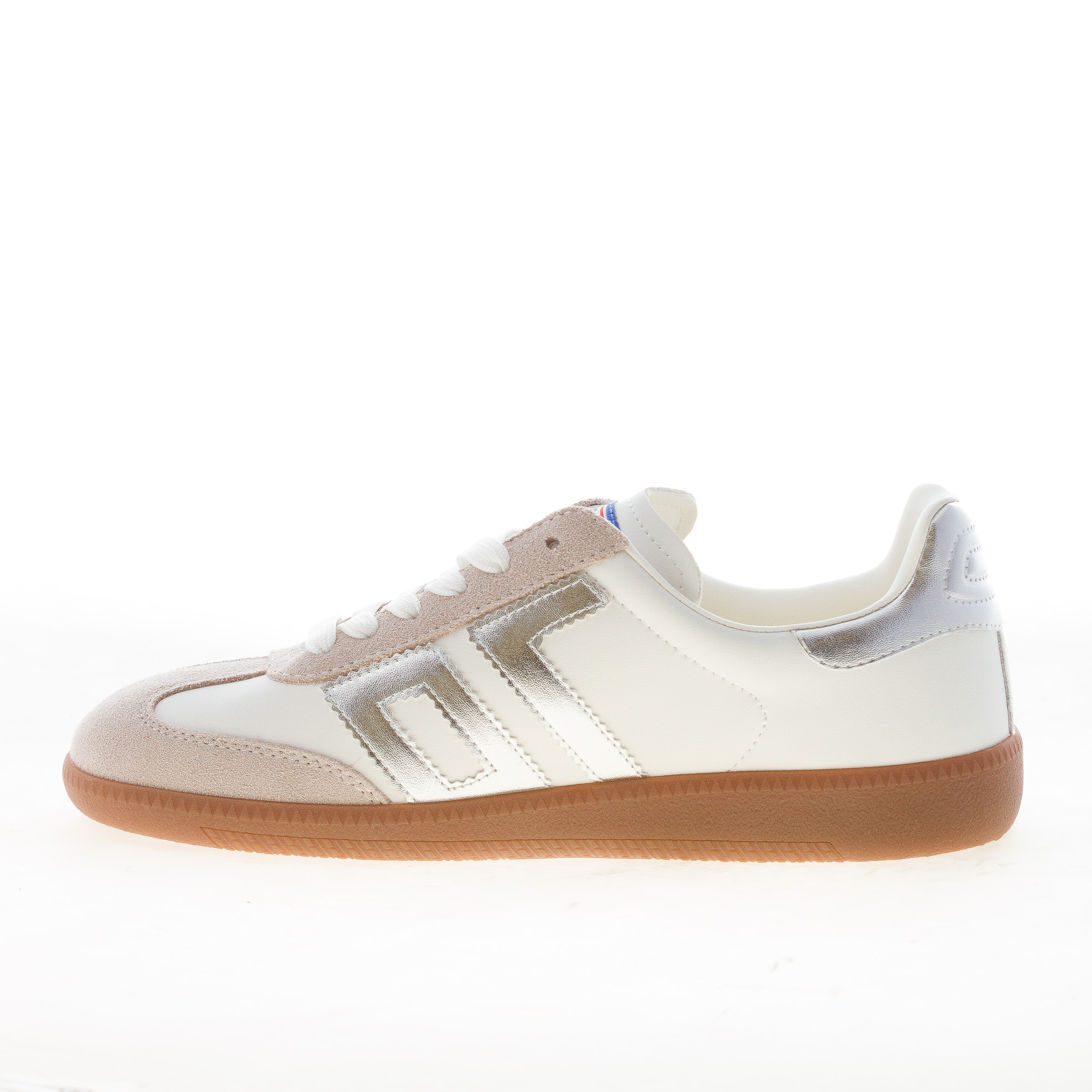 Cloud Metallic Silver sneaker made in soft milk tone leather and light beige suede with silver metallic leather logo 70 at side and back detail. Removable footbed of 1,5 cm. Rubber sole with a 2,5 cm height at the heel.